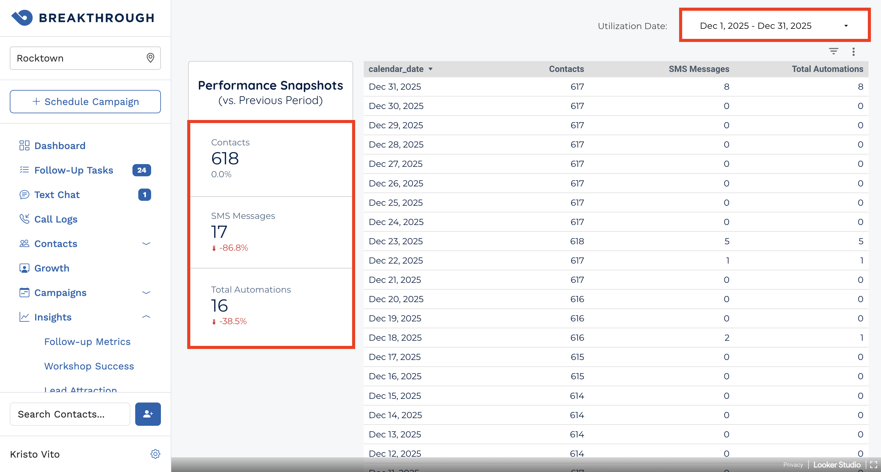 Example: A snapshot showing a decrease in SMS Messages may reflect a period where your cold market funnels were less active compared to the month prior.